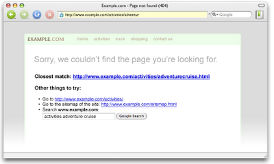 举例来说:Jamie在email里收到这样一个链接www.example.com/activities/adventurecruise.html。由于email客户端的格式问题,这个网址被删减成www.example.com/activites/adventur。所以,一个404页面就自然而然地出现了。然而,在嵌入这个404小工具后,她就可以看到如下信息: